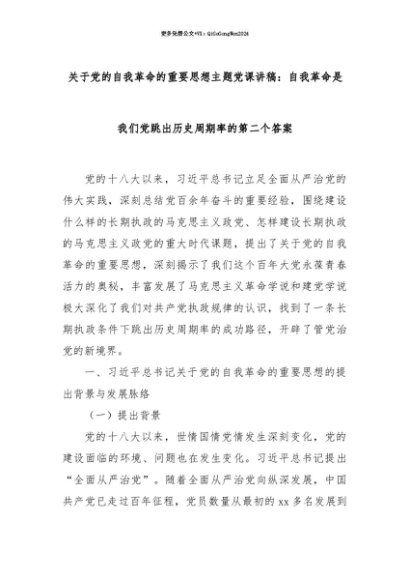 【七哥公文】2025年:【七哥公文】关于党的自我革命的重要思想主题党课讲稿:自我革命是我们党跳出历史周期率的第二个答案+更多免费公文+VX:QiGeGongWen2024+更多免费公文+VX:QiGeGongWen2024