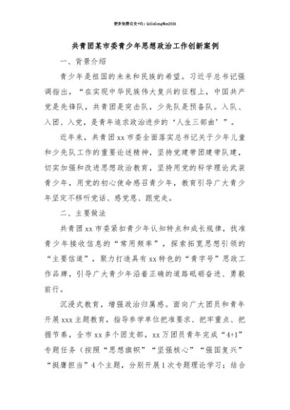 【七哥公文】2025年:【七哥公文】共青团某市委青少年思想政治工作创新案例+更多免费公文+VX:QiGeGongWen2024+更多免费公文+VX:QiGeGongWen2024
