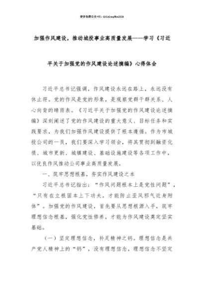 【七哥公文】2025年:【七哥公文】加强作风建设,推动城投事业高质量发展——学习《习近平关于加强党的作风建设论述摘编》心得体会+更多免费公文+VX:QiGeGongWen2024+更多免费公文+VX:QiGeGongWen2024