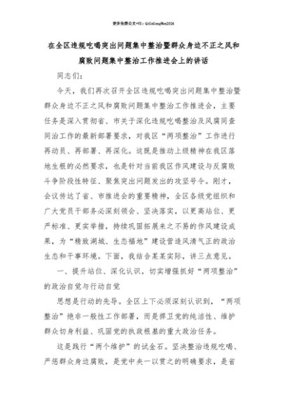 【七哥公文】2025年:【七哥公文】在全区违规吃喝突出问题集中整治暨群众身边不正之风和腐败问题集中整治工作推进会上的讲话+更多免费公文+VX:QiGeGongWen2024+更多免费公文+VX:QiGeGongWen2024