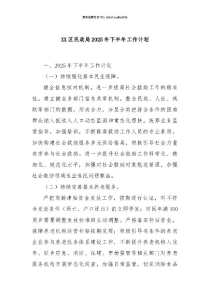 【七哥公文】2025年:【七哥公文】XX区民政局2025年下半年工作计划+更多免费公文+VX:QiGeGongWen2024+更多免费公文+VX:QiGeGongWen2024