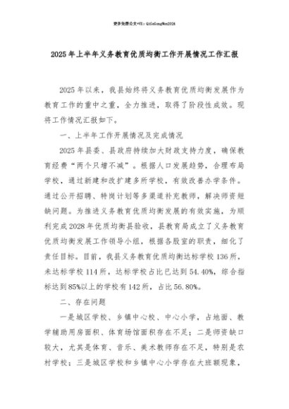 【七哥公文】2025年:【七哥公文】2025年上半年义务教育优质均衡工作开展情况工作汇报+更多免费公文+VX:QiGeGongWen2024+更多免费公文+VX:QiGeGongWen2024