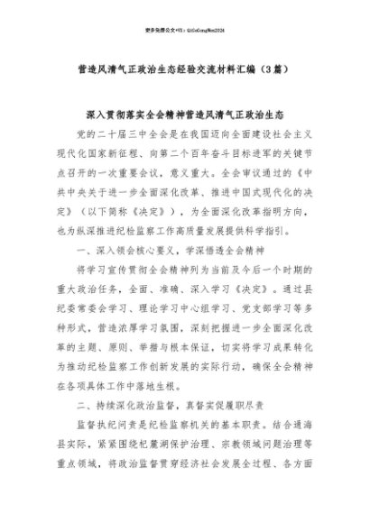 【七哥公文】2025年:【七哥公文】(3篇)营造风清气正政治生态经验交流材料汇编+更多免费公文+VX:QiGeGongWen2024+更多免费公文+VX:QiGeGongWen2024