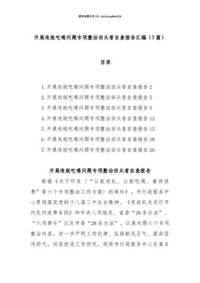 【七哥公文】2025年:【七哥公文】(7篇)开展违规吃喝问题专项整治回头看自查报告汇编+更多免费公文+VX:QiGeGongWen2024+更多免费公文+VX:QiGeGongWen2024