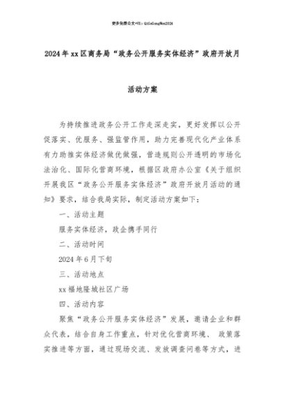 【七哥公文】2025年:【七哥公文】2024年xx区商务局“政务公开服务实体经济”政府开放月活动方案+更多免费公文+VX:QiGeGongWen2024+更多免费公文+VX:QiGeGongWen2024