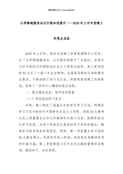 【七哥公文】2025年:【七哥公文】以学铸魂强信念以行践知促提升——2025年上半年党建工作亮点总结+更多免费公文+VX:QiGeGongWen2024+更多免费公文+VX:QiGeGongWen2024