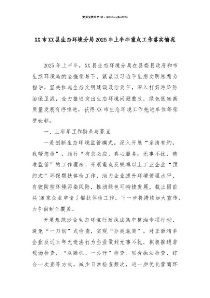 【七哥公文】2025年:【七哥公文】XX市XX县生态环境分局2025年上半年重点工作落实情况+更多免费公文+VX:QiGeGongWen2024+更多免费公文+VX:QiGeGongWen2024