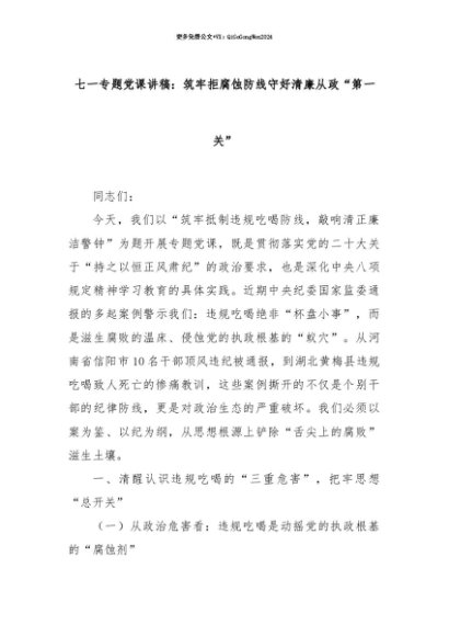 【七哥公文】2025年:【七哥公文】七一专题党课讲稿:筑牢拒腐蚀防线守好清廉从政“第一关”+更多免费公文+VX:QiGeGongWen2024+更多免费公文+VX:QiGeGongWen2024