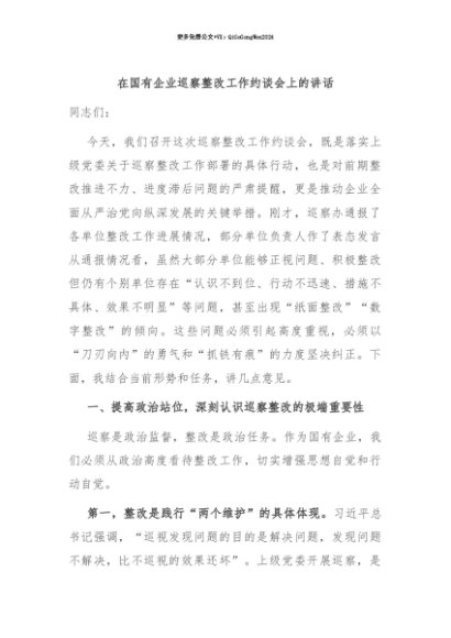 【七哥公文】2025年:【七哥公文】在国有企业巡察整改工作约谈会上的讲话+更多免费公文+VX:QiGeGongWen2024+更多免费公文+VX:QiGeGongWen2024