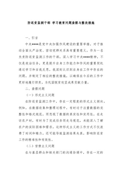 【七哥公文】2025年:【七哥公文】防返贫监测干部 学习教育问题查摆与整改措施+更多免费公文+VX:QiGeGongWen2024+更多免费公文+VX:QiGeGongWen2024