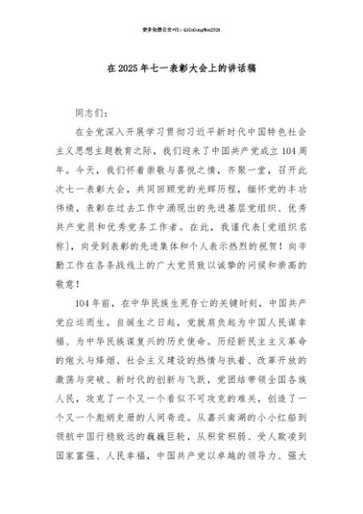 【七哥公文】2025年:【七哥公文】在2025年七一表彰大会上的讲话稿+更多免费公文+VX:QiGeGongWen2024+更多免费公文+VX:QiGeGongWen2024