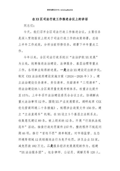 【七哥公文】2025年:【七哥公文】在XX区司法行政工作推进会议上的讲话+更多免费公文+VX:QiGeGongWen2024+更多免费公文+VX:QiGeGongWen2024