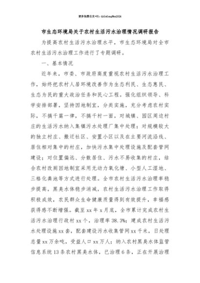 【七哥公文】2025年:【七哥公文】市生态环境局关于农村生活污水治理情况调研报告+更多免费公文+VX:QiGeGongWen2024+更多免费公文+VX:QiGeGongWen2024
