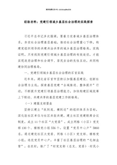 【七哥公文】2025年:【七哥公文】经验材料:党建引领城乡基层社会治理的实践探索+更多免费公文+VX:QiGeGongWen2024+更多免费公文+VX:QiGeGongWen2024