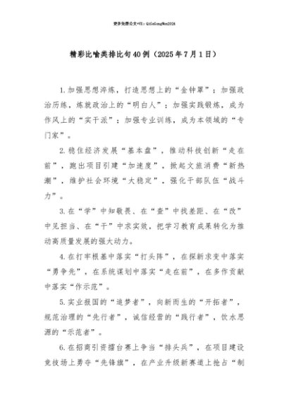【七哥公文】2025年:【七哥公文】精彩比喻类排比句40例(2025年7月1日)+更多免费公文+VX:QiGeGongWen2024+更多免费公文+VX:QiGeGongWen2024