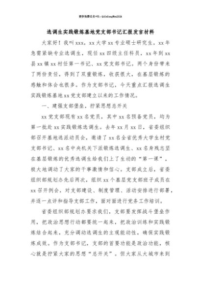 【七哥公文】2025年:【七哥公文】选调生实践锻炼基地党支部书记汇报发言材料+更多免费公文+VX:QiGeGongWen2024+更多免费公文+VX:QiGeGongWen2024