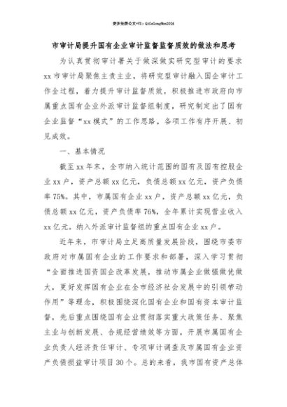 【七哥公文】2025年:【七哥公文】市审计局提升国有企业审计监督监督质效的做法和思考+更多免费公文+VX:QiGeGongWen2024+更多免费公文+VX:QiGeGongWen2024