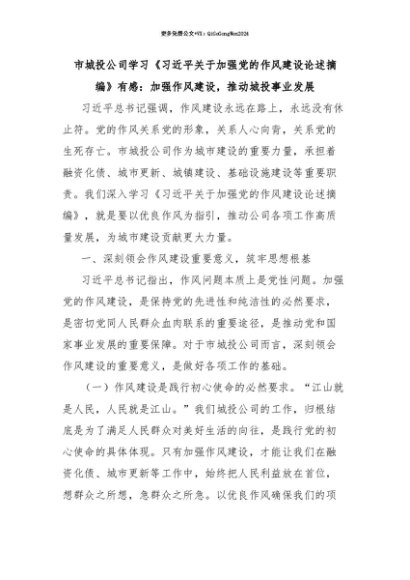 【七哥公文】2025年:【七哥公文】市城投公司学习《习近平关于加强党的作风建设论述摘编》有感:加强作风建设,推动城投事业发展+更多免费公文+VX:QiGeGongWen2024+更多免费公文+VX:QiGeGongWen2024