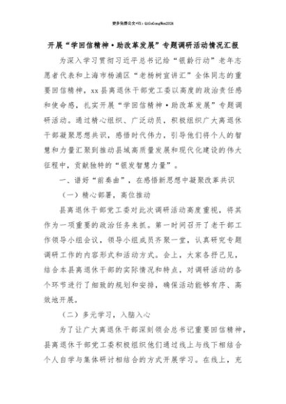 【七哥公文】2025年:【七哥公文】开展“学回信精神·助改革发展”专题调研活动情况汇报+更多免费公文+VX:QiGeGongWen2024+更多免费公文+VX:QiGeGongWen2024