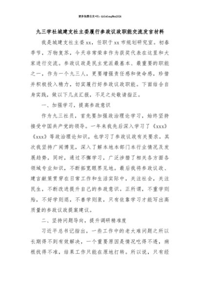 【七哥公文】2025年:【七哥公文】九三学社城建支社主委履行参政议政职能交流发言材料+更多免费公文+VX:QiGeGongWen2024+更多免费公文+VX:QiGeGongWen2024