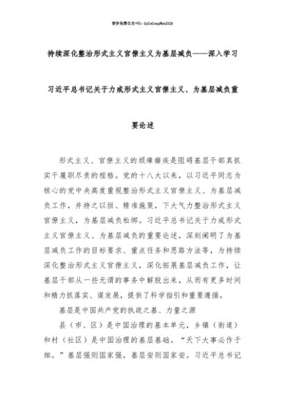 【七哥公文】2025年:【七哥公文】持续深化整治形式主义官僚主义为基层减负——深入学习总书记关于力戒形式主义官僚主义、为基层减负重要论述+更多免费公文+VX:QiGeGongWen2024+更多免费公文+VX:QiGeGongWen2024