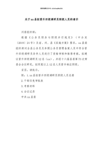 【七哥公文】2025年:【七哥公文】关于xx县拟晋升四级调研员职级人员的请示+更多免费公文+VX:QiGeGongWen2024+更多免费公文+VX:QiGeGongWen2024
