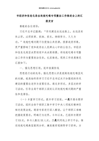 【七哥公文】2025年:【七哥公文】市经济和信息化局在违规吃喝专项整治工作推进会上的汇报发言+更多免费公文+VX:QiGeGongWen2024+更多免费公文+VX:QiGeGongWen2024