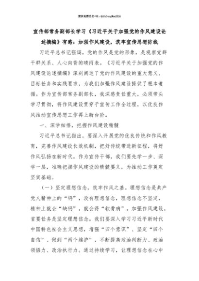 【七哥公文】2025年:【七哥公文】宣传部常务副部长学习《习近平关于加强党的作风建设论述摘编》有感:加强作风建设,筑牢宣传思想防线+更多免费公文+VX:QiGeGongWen2024+更多免费公文+VX:QiGeGongWen2024
