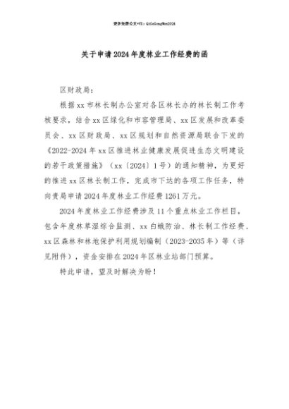 【七哥公文】2025年:【七哥公文】关于申请2024年度林业工作经费的函+更多免费公文+VX:QiGeGongWen2024+更多免费公文+VX:QiGeGongWen2024