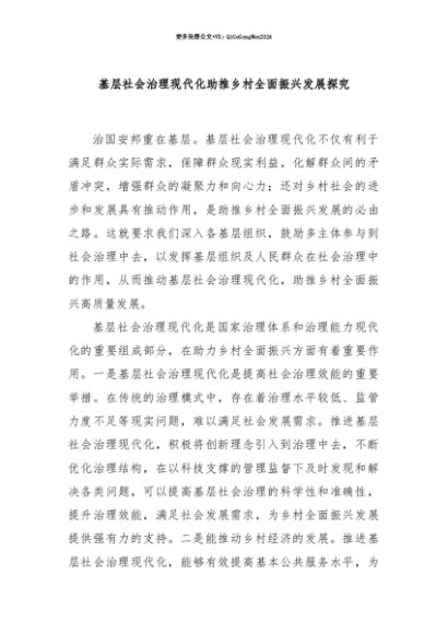 【七哥公文】2025年:【七哥公文】基层社会治理现代化助推乡村全面振兴发展探究+更多免费公文+VX:QiGeGongWen2024+更多免费公文+VX:QiGeGongWen2024