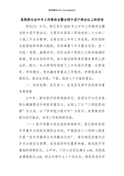 【七哥公文】2025年:【七哥公文】医院院长在半年工作推进会暨全院中层干部会议上的讲话+更多免费公文+VX:QiGeGongWen2024+更多免费公文+VX:QiGeGongWen2024