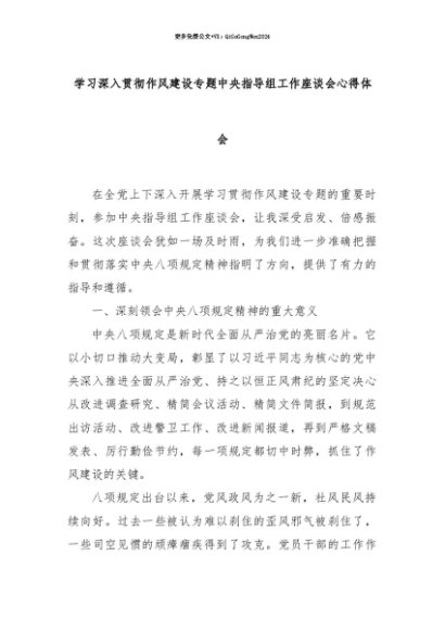 【七哥公文】2025年:【七哥公文】学习深入贯彻作风建设专题中央指导组工作座谈会心得体会+更多免费公文+VX:QiGeGongWen2024+更多免费公文+VX:QiGeGongWen2024
