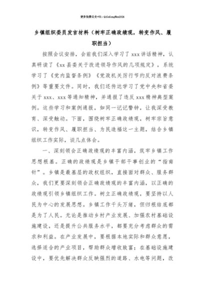 【七哥公文】2025年:【七哥公文】乡镇组织委员发言材料(树牢正确政绩观,转变作风、履职担当)+更多免费公文+VX:QiGeGongWen2024+更多免费公文+VX:QiGeGongWen2024