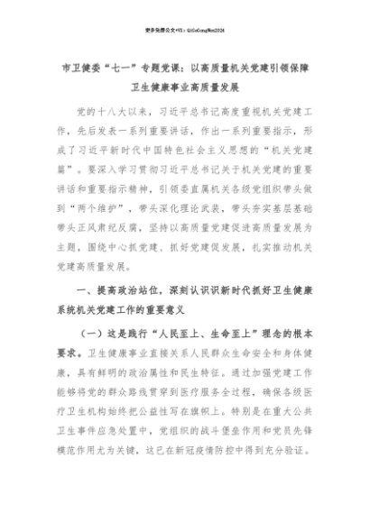 【七哥公文】2025年:【七哥公文】市卫健委“七一”专题党课:以高质量机关党建引领保障卫生健康事业高质量发展+更多免费公文+VX:QiGeGongWen2024+更多免费公文+VX:QiGeGongWen2024