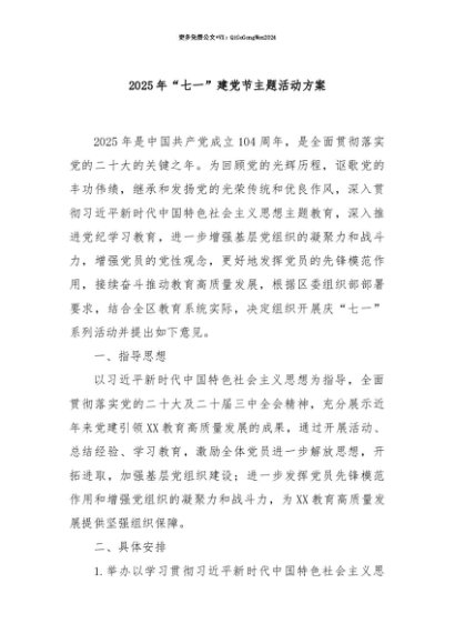 【七哥公文】2025年:【七哥公文】2025年“七一”建党节主题活动方案+更多免费公文+VX:QiGeGongWen2024+更多免费公文+VX:QiGeGongWen2024