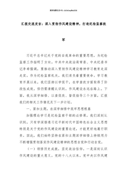 【七哥公文】2025年:【七哥公文】汇报交流发言:深入贯彻作风建设精神,打造纪检监察铁军+更多免费公文+VX:QiGeGongWen2024+更多免费公文+VX:QiGeGongWen2024