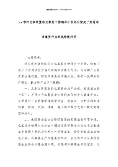 【七哥公文】2025年:【七哥公文】xx市打击和处置非法集资工作领导小组办公室关于防范非法集资行为的风险提示函+更多免费公文+VX:QiGeGongWen2024+更多免费公文+VX:QiGeGongWen2024