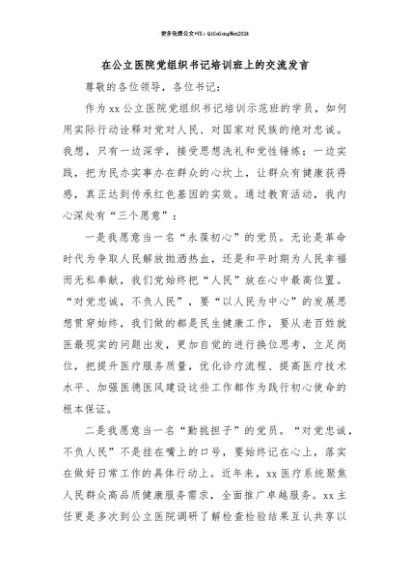 【七哥公文】2025年:【七哥公文】在公立医院党组织书记培训班上的交流发言+更多免费公文+VX:QiGeGongWen2024+更多免费公文+VX:QiGeGongWen2024