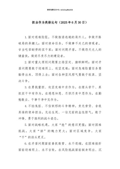 【七哥公文】2025年:【七哥公文】担当作为类排比句(2025年6月30日)+更多免费公文+VX:QiGeGongWen2024+更多免费公文+VX:QiGeGongWen2024