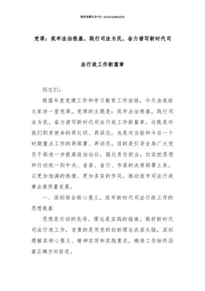 【七哥公文】2025年:【七哥公文】党课:筑牢法治根基,践行司法为民,奋力谱写新时代司法行政工作新篇章+更多免费公文+VX:QiGeGongWen2024+更多免费公文+VX:QiGeGongWen2024