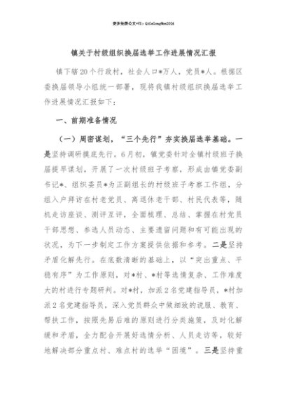 【七哥公文】2025年:【七哥公文】镇关于村级组织换届选举工作进展情况汇报+更多免费公文+VX:QiGeGongWen2024+更多免费公文+VX:QiGeGongWen2024