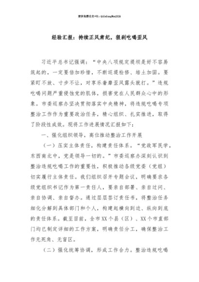 【七哥公文】2025年:【七哥公文】经验汇报:持续正风肃纪,狠刹吃喝歪风+更多免费公文+VX:QiGeGongWen2024+更多免费公文+VX:QiGeGongWen2024