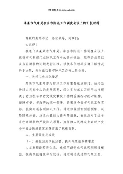 【七哥公文】2025年:【七哥公文】某某市气象局在全市防汛工作调度会议上的汇报材料+更多免费公文+VX:QiGeGongWen2024+更多免费公文+VX:QiGeGongWen2024