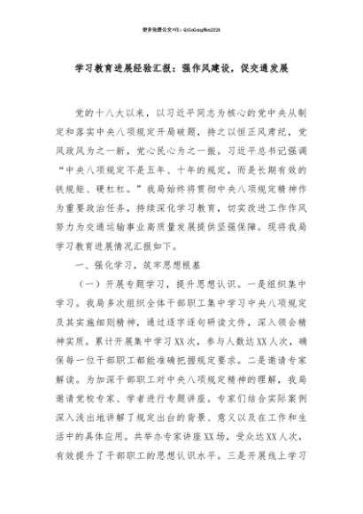 【七哥公文】2025年:【七哥公文】学习教育进展经验汇报:强作风建设,促交通发展+更多免费公文+VX:QiGeGongWen2024+更多免费公文+VX:QiGeGongWen2024