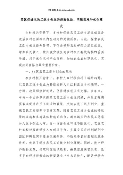 【七哥公文】2025年:【七哥公文】某区促进农民工返乡创业的经验做法、问题困难和优化建议+更多免费公文+VX:QiGeGongWen2024+更多免费公文+VX:QiGeGongWen2024
