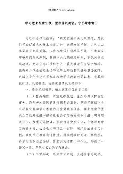 【七哥公文】2025年:【七哥公文】学习教育经验汇报:狠抓作风建设,守护绿水青山+更多免费公文+VX:QiGeGongWen2024+更多免费公文+VX:QiGeGongWen2024