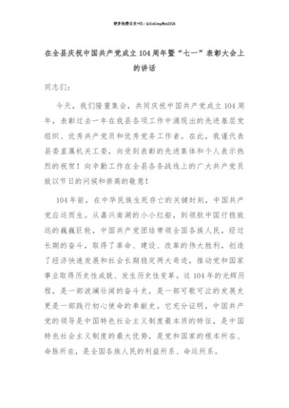 【七哥公文】2025年:【七哥公文】在全县庆祝中国共产党成立104周年暨“七一”表彰大会上的讲话+更多免费公文+VX:QiGeGongWen2024+更多免费公文+VX:QiGeGongWen2024