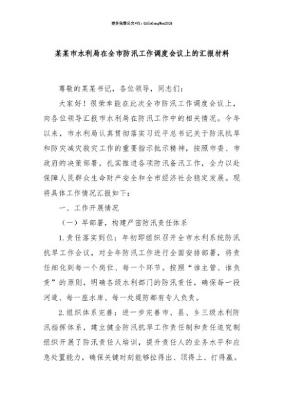 【七哥公文】2025年:【七哥公文】某某市水利局在全市防汛工作调度会议上的汇报材料+更多免费公文+VX:QiGeGongWen2024+更多免费公文+VX:QiGeGongWen2024
