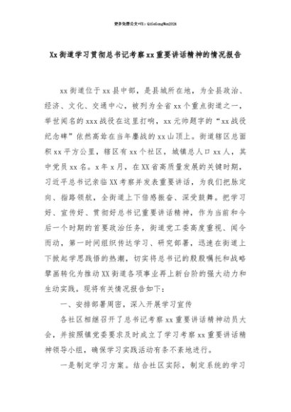 【七哥公文】2025年:【七哥公文】Xx街道学习贯彻总书记考察xx重要讲话精神的情况报告+更多免费公文+VX:QiGeGongWen2024+更多免费公文+VX:QiGeGongWen2024
