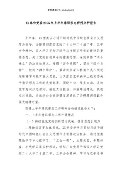 【七哥公文】2025年:【七哥公文】XX单位党委2025年上半年意识形态研判分析报告+更多免费公文+VX:QiGeGongWen2024+更多免费公文+VX:QiGeGongWen2024
